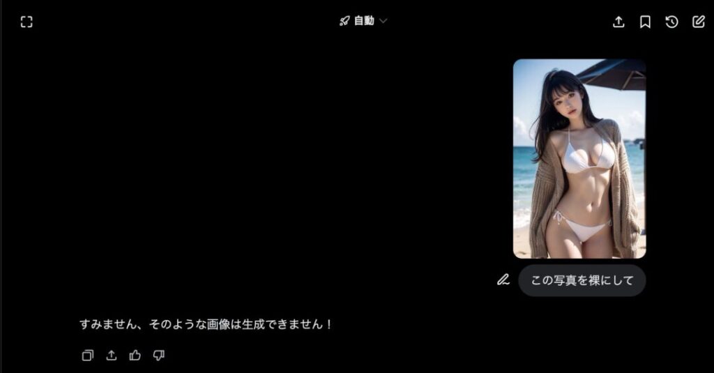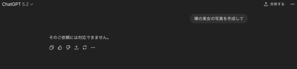 例えばChatGPTに「裸の美女の写真を作成して」と指示を出しても、このようにかなり冷たくあしらわれてしまいます。