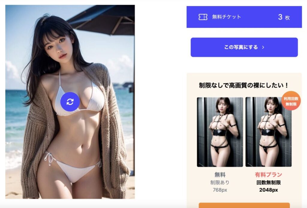 こちらのAIを活用する場合、一発で裸の画像を生成するのではなく、一度服を着た画像を生成して、そこから服を脱がせるという2段階で画像を生成することになりそうですね。