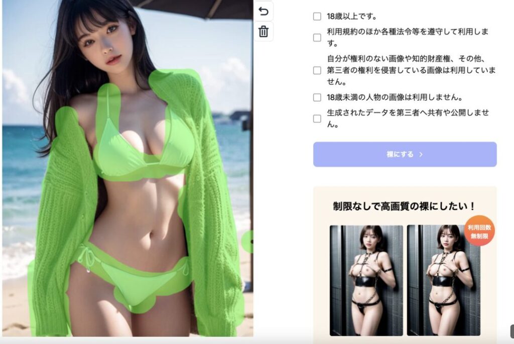 Nudefusionは名前の通り服を着ている画像を裸に変身させるAIです。こちら使い方はシンプルで、裸にしたい画像をアップロードし、服の部分をなぞると、なぞった部分が消えて裸になる、というものです。