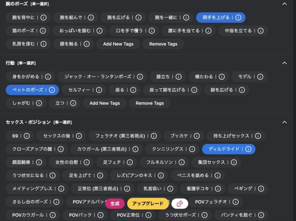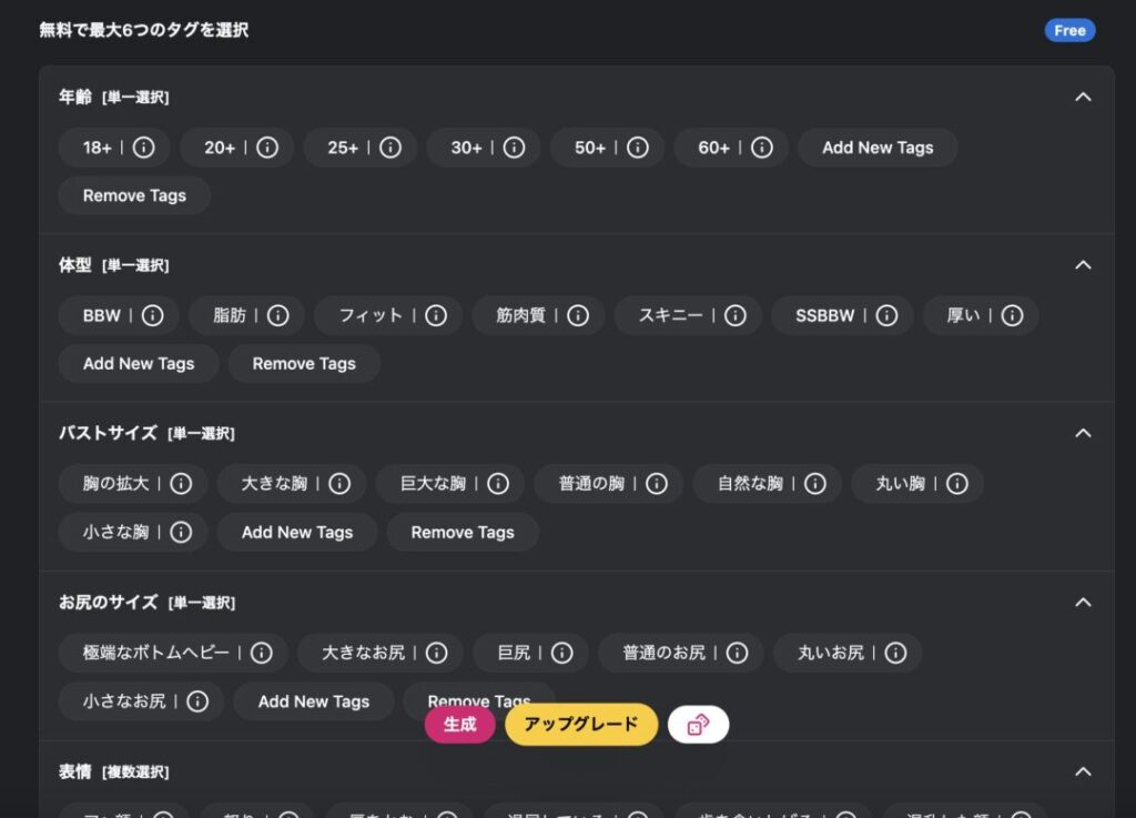その後、年齢や体型などを選んでいきます。その他にもバストサイズやお尻のサイズ、ポージングやセックスの体位、場所、写真の構図など、細かく要素を選択できます。