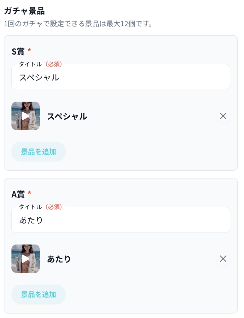 その後、ガチャの景品を設定していきます。景品はS賞, A賞, B賞とランクごとに設定でき、1つのガチャで最大12種類の景品を用意できます。