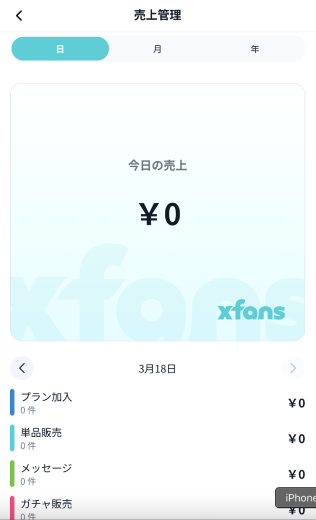 まずは売上に関してです。売上はマイページの「売上管理」というメニューから確認できます。日ごと、月ごと、年ごとに売上を見ることができ、プラン加入や単品販売、メッセージ、ガチャ販売など、どのジャンルの商品の売り上げが多かったかという割合も見ることができます。