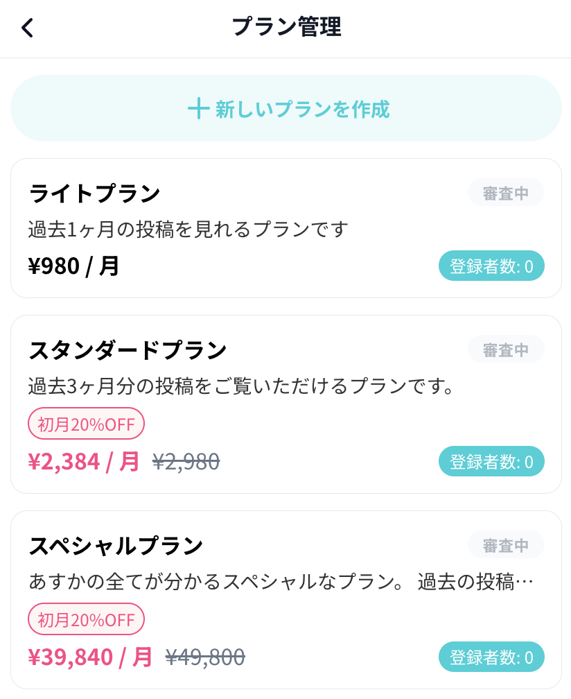 マイページに移動すると、「プラン管理」というメニューがあるので、ここからファンクラブメニューの作成を行えます。