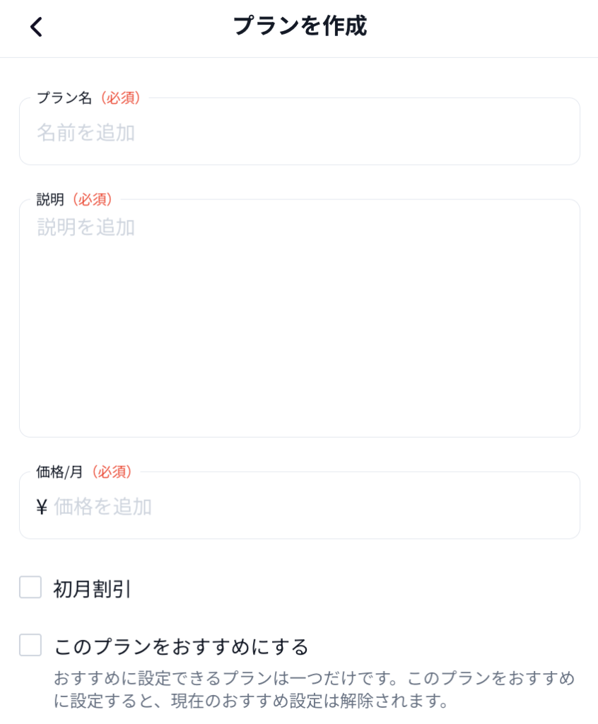 新しいプランを作成を選択すると、プラン名や説明、金額などを設定できる画面に映るので、ここでファンクラブの設定を行いましょう。
